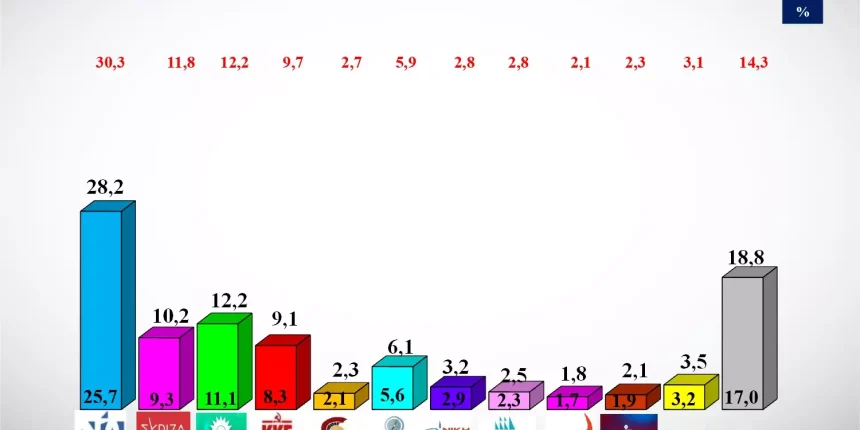Συγκεκριμένα, η ΝΔ συγκεντρώνει ποσοστό 28,2% έναντι 12,2% του ΠΑΣΟΚ-ΚΙΝΑΛ. Στην τρίτη θέση βρίσκεται ο ΣΥΡΙΖΑ με 10,2%, ενώ ακολουθούν το ΚΚΕ με 9,1%, η Ελληνική Λύση με 6,1%, η Νίκη με 3,2%, η Πλεύση Ελευθερίας με 2,5% και οι Σπαρτιάτες με 2,3%.