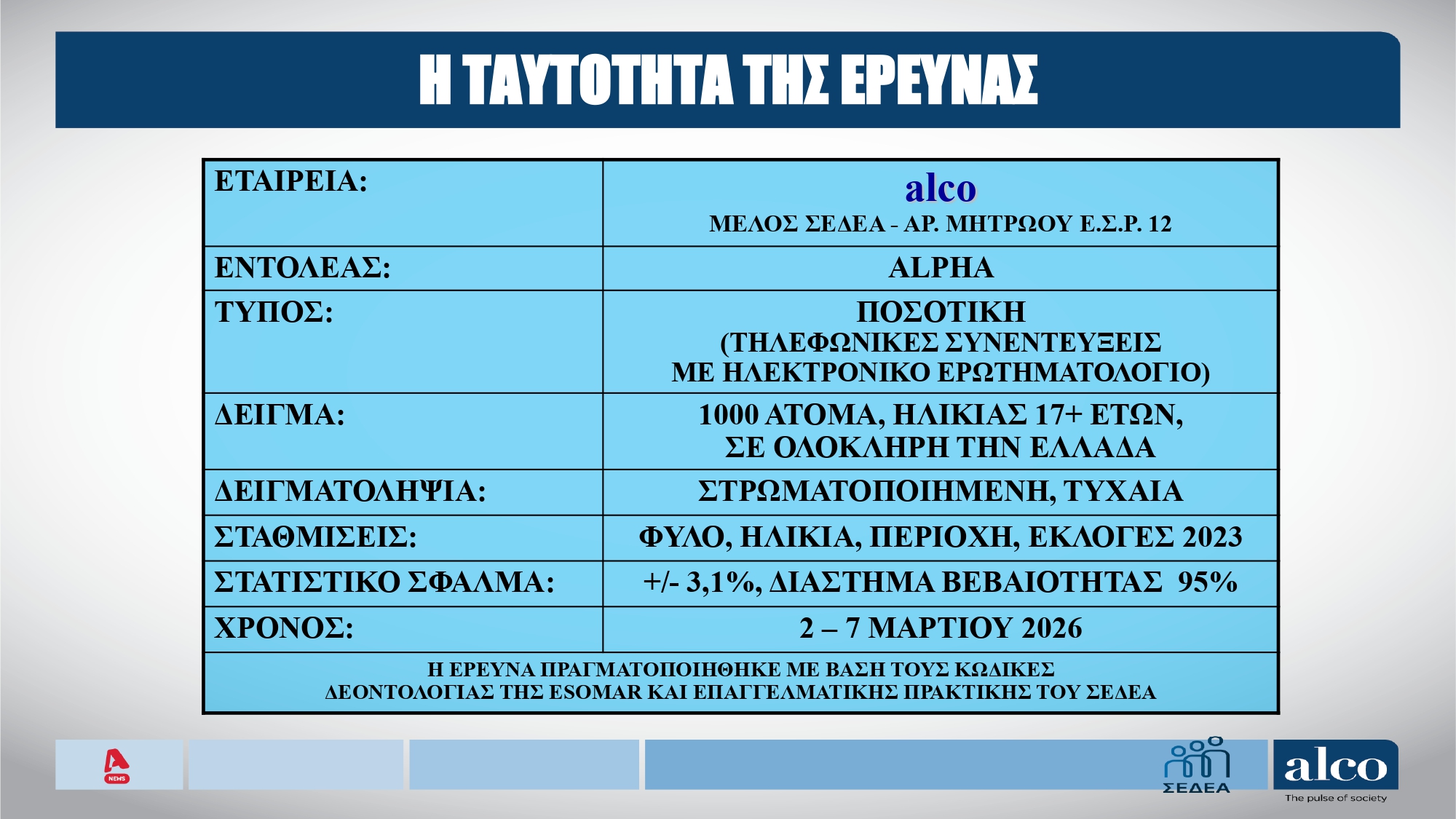 Κέρδη αποκομίζουν η ΝΔ, το ΠΑΣΟΚ, το ΚΚΕ και ο ΣΥΡΙΖΑ σύμφωνα με τη δημοσκόπηση που διενήργησε η Alco για τον Alpha, το διάστημα 2-7 Μαρτίου 2026.