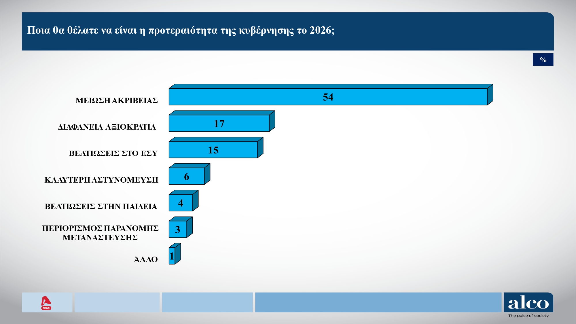 Πάνω από τους μισούς (54%) θα ήθελαν η προτεραιότητα της κυβέρνησης το 2026 να είναι η μείωση της ακρίβειας, ενώ ακολουθούν η διαφάνεια/αξιοκρατία σε ποσοστό 17%, οι βελτιώσεις στο ΕΣΥ με ποσοστό 15%, η καλύτερη αστυνόμευση σε ποσοστό 6%, οι βελτιώσεις στην παιδεία σε ποσοστό 4% και ο περιορισμός της παράνομης μετανάστευσης σε ποσοστό 3%.
