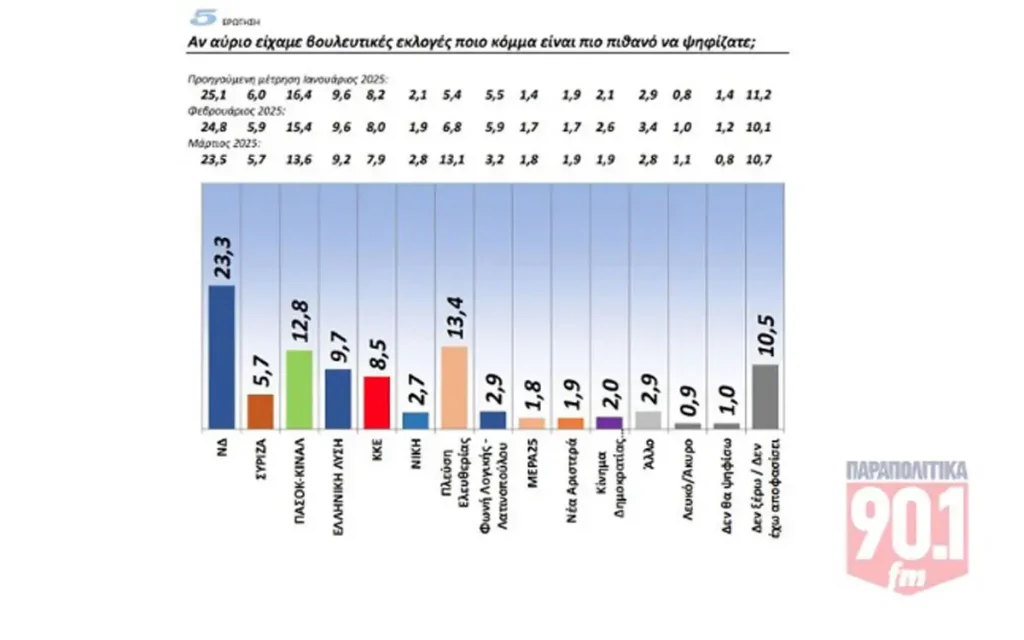 Σύμφωνα με τη δημοσκόπηση η Νέα Δημοκρατία καταγράφει ποσοστό 23,3% στην πρόθεση ψήφου (25,1% Ιανουάριος 2025, 24,8% Φεβρουάριος 2025, 23,5% Μάρτιος 2025) και η Πλεύση Ελευθερίας της Ζωής Κωνσταντοπούλου συνεχίζει την ανοδική πορεία και έρχεται δεύτερο κόμμα με 13,4% (5,4% Ιανουάριος 2025, 6,8% Φεβρουάριος 2025, 13,1% Μάρτιος 2025). Το ΠΑΣΟΚ εξακολουθεί να έχει απώλειες συγκεντρώνοντας 12,8% (16,4% Ιανουάριος 2025, 15,4% Φεβρουάριος 2025, 13,6% Μάρτιος 2025). Ο ΣΥΡΙΖΑ, από την άλλη, καταγράφει 5,7%(είχε 6% τον Ιανουάριο, 5,9% τον Φεβρουάριο και 5,7 τον Μάρτιο). Ενισχυμένη η Ελληνική Λύση με 9,7% και ακολουθούν το ΚΚΕ με 8,5% και η Νίκη με 2,7%, ενώ αναποφάσιστοι δηλώνουν το 10,5%.
