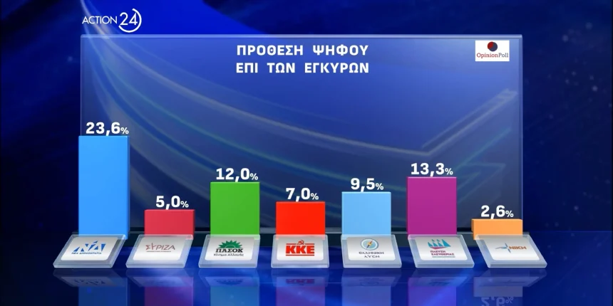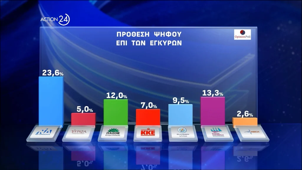 Συγκεκριμένα στην πρόθεση ψήφου, η ΝΔ είναι στην πρώτη θέση με 23,6% και ακολουθούν η Πλεύση Ελευθερίας με 13,3%, το ΠΑΣΟΚ με 12%, η Ελληνική Λύση με 9,5%, το ΚΚΕ με 7%, ο ΣΥΡΙΖΑ με 5%, η Φωνή Λογικής με 3,4%, η Νίκη με 2,6%, το Κίνημα Δημοκρατίας με 2%, το ΜέΡΑ25 με 1,9%, η Νέα Αριστερά και οι Σπαρτιάτες με 1%. Το ποσοστό των αναποφάσιστων ανέρχεται σε 16,3%.