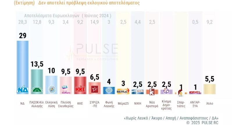 Αμετάβλητη εμφανίζεται η δυναμική των κομμάτων σύμφωνα με τη νέα δημοσκόπηση της Pulse για λογαριασμό του ΣΚΑΙ.