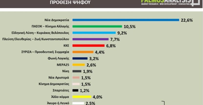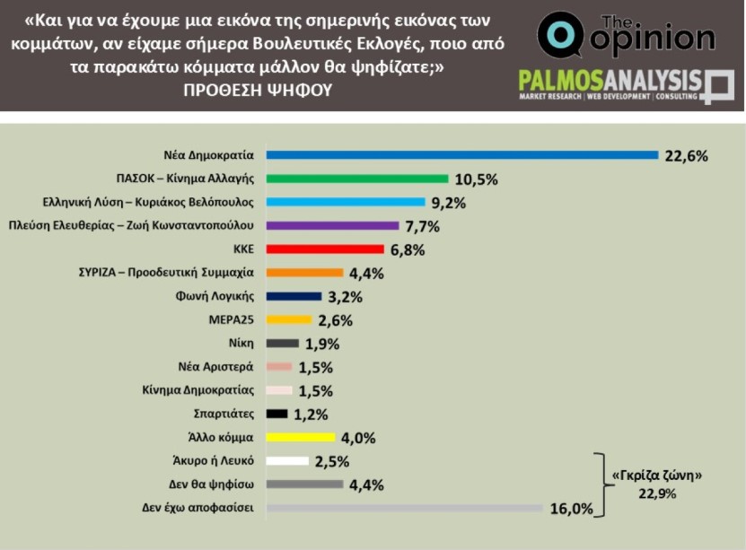 Μεγάλο προβάδισμα από το δεύτερο ΠΑΣΟΚ έχει η Νέα Δημοκρατία σε δημοσκόπηση της Palmos Analysis για την ιστοσελίδα TheOpinion, με το κυβερνών κόμμα να συγκεντρώνει 29,3% στην εκτίμηση εκλογικής επιρροής, ενώ το ΠΑΣΟΚ συγκεντρώνει 13,6%.