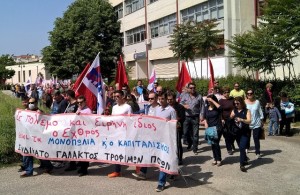 Με πανό, σημαίες και συνθήματα οι συγκεντρωμένοι καταδίκασαν την κυβερνητική πολιτική και την Ευρωπαική Ενωση.