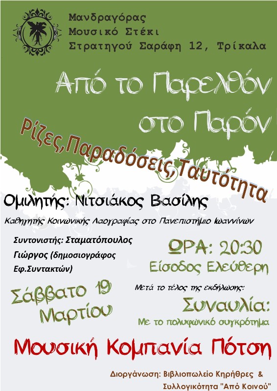 Η συλλογικότητα «Από Κοινού» και το βιβλιοπωλείο Κηρήθρες σε συνεργασία με τη μουσική σκηνή Μανδραγόρας σας προσκαλούν το Σάββατο 19 Μαρτίου στις 20:30, σε μια βραδιά όπου θα συνδυάσουμε τις γνώσεις για τις ρίζες και παραδόσεις μας, με άφθονο κέφι και παραδοσιακή μουσική.