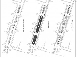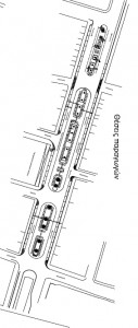 – Διαπλατύνσεις των απέναντι πεζοδρομίων στις διασταυρώσεις, ώστε να εξασφαλίσουν χώρο στάθμευσης πλάτους 2,00 μέτρων και λωρίδα κυκλοφορίας ελάχιστου πλάτους 3,50 μέτρων.