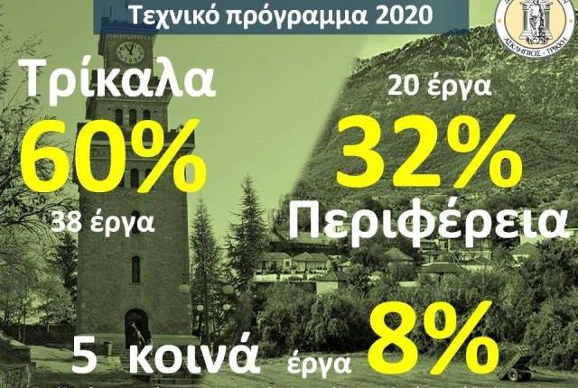 Για το 2020, ο Δήμος Τρικκαίων προγραμμάτισε 63 έργα ύψους 12.884.521,47€, εκ των οποίων τα 23 είναι νέα έργα. Τα δε έργα από το Σχέδιο Βιώσιμης Αστικής Ανάπτυξης ανέρχονται σε 9.790.000 € και θα προστεθούν σε όσα θα υλοποιηθούν στον Δήμο (αναπλάσεις κεντρικών πλατειών, Ληθαίος, open mall, είσοδος από Καρδίτσα, κυκλικοί κόμβοι κ.α.).
