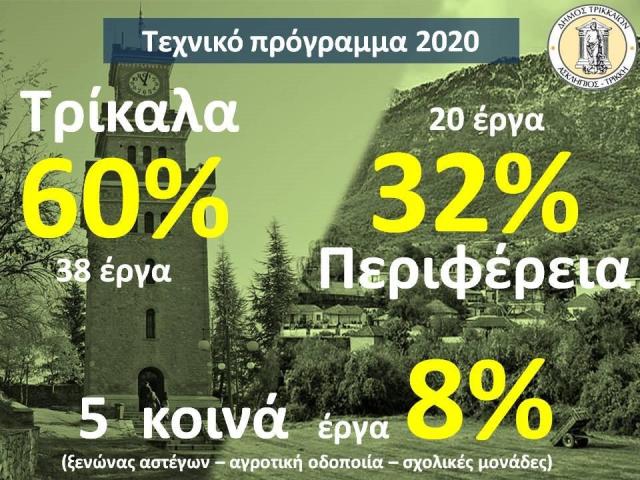 Για το 2020, ο Δήμος Τρικκαίων προγραμμάτισε 63 έργα ύψους 12.884.521,47€, εκ των οποίων τα 23 είναι νέα έργα. Τα δε έργα από το Σχέδιο Βιώσιμης Αστικής Ανάπτυξης ανέρχονται σε 9.790.000 € και θα προστεθούν σε όσα θα υλοποιηθούν στον Δήμο (αναπλάσεις κεντρικών πλατειών, Ληθαίος, open mall, είσοδος από Καρδίτσα, κυκλικοί κόμβοι κ.α.).