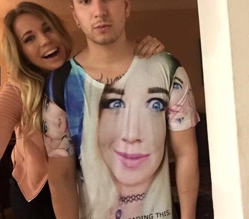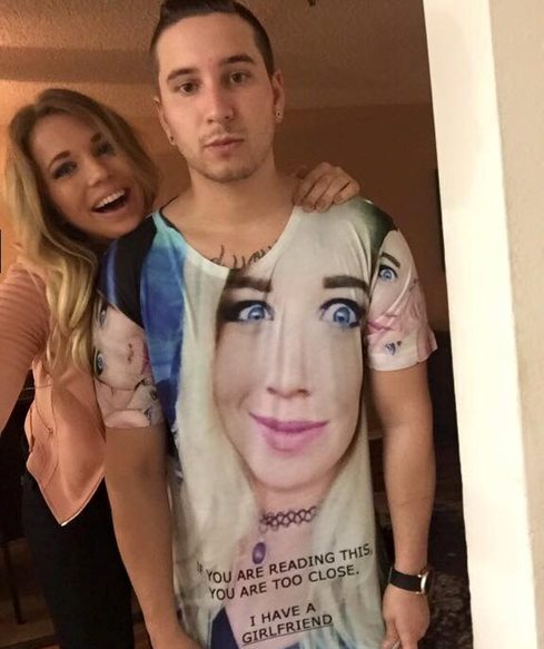 Όπως φαίνεται στη φωτογραφία (με την ίδια να επισημαίνει την…έκφρασή του), η μπλούζα έχει το πρόσωπό της όχι μία, αλλά τρεις φορές, με γουρλωμένα μάτια, και γράφει πάνω «αν το διαβάζετε αυτό, έχετε πλησιάσει πολύ- έχω κοπέλα».