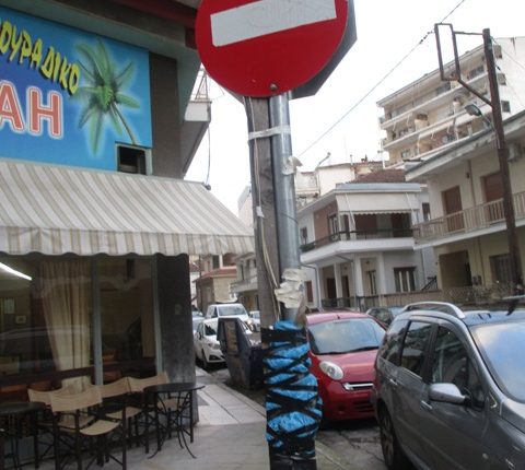 Δείτε στις φωτο του trikaladay τον τρόπο που στήριξαν οι εργάτες του Δήμου την πινακίδα του κώδικα Οδικής Κυκλοφορίας.