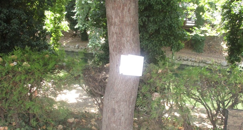 Όπως κατέγραψε το trikaladay, πάνω στο κορμό δέντρου που βρίσκεται στο παραποτάμιο πεζοδρόμιο στην οδό Ιακωβάκη κάρφωσε με μια βίδα ένα χαρτάκι το οποίο γράφει «ΜΗ ΚΑΤΟΥΡΑΤΕ ΤΟ ΔΕΝΤΡΟ».