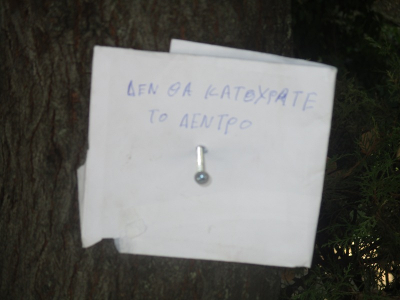 Όπως κατέγραψε το trikaladay, πάνω στο κορμό δέντρου που βρίσκεται στο παραποτάμιο πεζοδρόμιο στην οδό Ιακωβάκη κάρφωσε με μια βίδα ένα χαρτάκι το οποίο γράφει «ΜΗ ΚΑΤΟΥΡΑΤΕ ΤΟ ΔΕΝΤΡΟ».