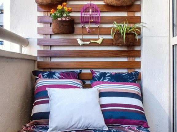 Κρεμάστε τις γλάστρες σας σε επιφάνεια πάνελ Μια εναλλακτική είναι αντί να βάλετε τα φυτά σας σε γλάστρες κάτω στο πάτωμα του μικρού σας μπαλκονιού είναι να τα κρεμάσετε πάνω σε κάποια επιφάνεια πάνελ, όπως αυτή μιας παλέτας ή ακόμη και κάποια άλλη έτοιμη επιφάνεια που θα βρείτε στο εμπόριο σχεδιασμένη γι’ αυτό το σκοπό. Σε καταστήματα με είδη για τον κήπο θα βρείτε ποικιλία σχεδίων, μεγεθών και χρωμάτων για γλάστρες. Μπορείτε να πάρετε έτοιμες γλάστρες με ενσωματωμένη βάση ή να διαλέξετε κάποια γλάστρα που σας αρέσει και να πάρετε έξτρα βάση για την τοποθέτησή της. Εάν ο χώρος είναι ιδιαίτερα περιορισμένος κρεμάστε τις γλάστρες από το 1 μέτρο και πάνω. Η υπόλοιπη πάνελ επιφάνεια από κάτω μπορεί να σας εξυπηρετήσει διαφορετικά ως έπιπλο για την βεράντα σας τοποθετώντας απλά μια μεγάλη μαξιλάρα ή ένα πουφ για μεγαλύτερη άνεση και 2 μικρότερα μαξιλάρια για την πλάτη.