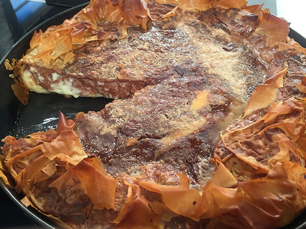 Ψήνουμε σε καλά προθερμασμένο φούρνο στις αντιστάσεις, στους 170°C στην κάτω σχάρα, για περίπου 45 λεπτά, μέχρι να ροδίσει καλά το φύλλο και σταθεροποιηθεί η κρέμα.