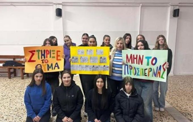 Με καθοδηγήτρια-σκηνοθέτη την καθηγήτρια των Μαθηματικών κα Αναγνωστοπούλου Αθανασία και με τη βοήθεια της καθηγήτριας των Καλλιτεχνικών κας Ράμπια Δέσποινας ,οι μαθήτριες έδειξαν με τον δικό τους βιωματικό τρόπο τις μορφές εκφοβισμού και κράτησαν στα χέρια τους τα συνθήματα<<ΜΗΝ ΤΟ ΠΡΟΣΠΕΡΝΑΣ>>, <<ΣΤΗΡΙΞΕ ΤΟ ΘΥΜΑ>> και σχημάτισαν με τα δάχτυλα των χεριών τους το δακτυλικό αποτύπωμα<<ΟΧΙ ΑΛΛΑ ΘΥΜΑΤΑ>>.