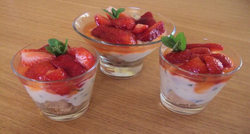- Για την συναρμολόγηση. Από τα υπόλοιπα 200γρ φράουλας κρατάμε 3 τεμάχια για την διακόσμηση. Τις υπόλοιπες τις κόβουμε σε μέτριες προς λεπτές φέτες και τις τοποθετούμε περιμετρικά μέσα στο ποτήρι. Με ένα μακρύ κουτάλι ή με το κορνέ ζαχαροπλαστικής μοιράζουμε και γεμίζουμε με την κρέμα γιαουρτιού τα ποτήρια. Καλύπτουμε την επιφάνεια της κρέμας μοιράζοντας και τον υπόλοιπο πουρέ φράουλας στα 6 ποτήρια