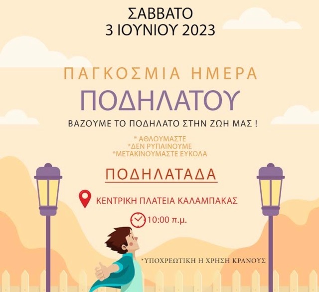 Έχετε σκεφτεί πόσο μπορεί να αλλάξει η πόλη και τα χωριά μας, πόσο θα αλλάξει η ζωή μας, αν κάνουμε μια… απλή κίνηση και βάλουμε στην καθημερινότητά μας το ποδήλατο;… Εμείς στη «Δύναμη Ευθύνης» το σκεφτήκαμε και το μοιραζόμαστε μαζί σας. Η 3η Ιουνίου τιμάται παγκόσμια ως «ημέρα ποδηλάτου» κι εμείς στέλνουμε μήνυμα από εδώ, από τα Μετέωρά μας, από την πόλη της Καλαμπάκας και βγαίνουμε στους δρόμους με αυτά. Φοράμε κράνος (… απαραίτητα) και δίνουμε ραντεβού στην πλατεία το Σάββατο 3 Ιουνίου στις 10 π.μ.. Κάνουμε μια μεγάλη ποδηλατοβόλτα και στέλνουμε μήνυμα για την πιο ανθρώπινη πόλη που θέλουμε. Κάνουμε προβολή στο μέλλον στην πόλη που μαζί θα φτιάξουμε για εμάς και τα παιδιά μας, με περισσότερους ελεύθερους χώρους, με ποδηλατόδρομους, με μεγάλα πεζοδρόμια. Παίρνουμε το μέλλον στα χέρια μας… Ραντεβού εκεί!!!