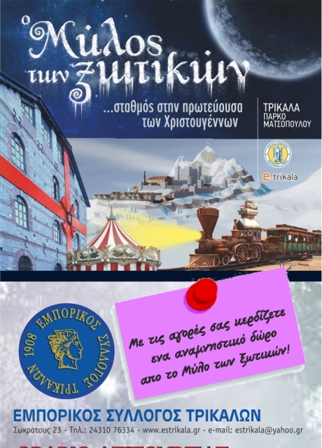 Ο Εμπορικός Σύλλογος Τρικάλων απέστειλε επιστολή προς τους συναδέλφους σχετικά με τις δύο επιπλέον δράσεις του Συλλόγου σύνδεσης της τοπικής αγοράς με τον Μύλο των Ξωτικών. Η επιστολή έχει ως εξής: Όπως όλοι βλέπουμε και βιώνουμε τα τελευταία 7 χρόνια ο “Μύλος των Ξωτικών” ήρθε και άλλαξε τα δεδομένα στην πόλη μας. Κατάφερε να κάνει τα Τρίκαλα “προορισμό” για όλες τις εποχές του χρόνου και να τα καταστήσει “πρωτεύουσα των Χριστουγέννων”, προσελκύοντας το ενδιαφέρον ταξιδιωτών από όλη την Ελλάδα. Έτσι δημιουργείται προστιθέμενη αξία που ενισχύει ξεκάθαρα όλους τους επαγγελματικούς κλάδους των Τρικάλων.