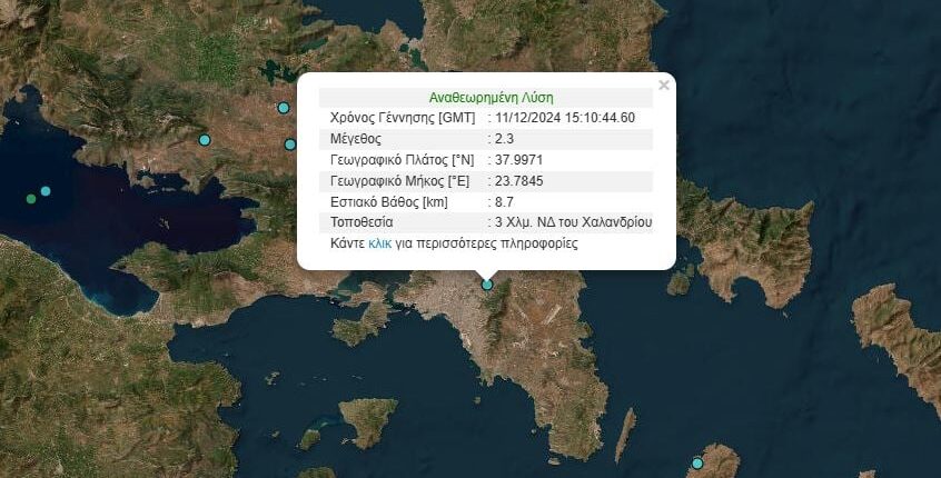 Δύο σεισμοί 2,3 και 2,8 Ρίχτερ αναστάτωσαν το απόγευμα της Τετάρτης 11 Δεκεμβρίου 2024 την Αθήνα. Οι σεισμικές δονήσεις έγιναν αισθητές σε όλη την πρωτεύουσα καθώς και σε πολλές περιοχές της Αττικής.