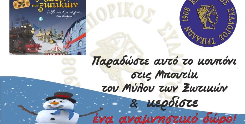 1η Δράση: Ο Εμπορικός Σύλλογος Τρικάλων σας παρέχει δωρεάν κουπόνια που θα μπορείτε να τα προσφέρετε στους πελάτες σας με τις αγορές τους από την επιχείρησή σας. Τα κουπόνια θα αντιστοιχούν σε αναμνηστικά δώρα που θα παραλαμβάνουν από τη γραμματεία του Μύλου.