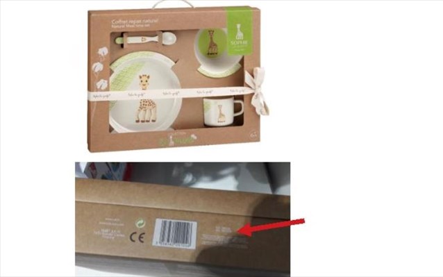 Συγκεκριμένα, πρόκειται για παιδικό σετ φαγητού 4 τεμαχίων που περιλαμβάνει πιάτο, μπολ, κούπα και κουτάλι, προέλευσης Κίνας, με εμπορική ονομασία “Sophie la giraffe”, με αριθμό παρτίδας 897275 και κωδικό προϊόντος Ref: 2201124. Το προϊόν διακινήθηκε στην Ελλάδα από την εταιρεία ΣΠ. ΝΤΟΒΑΣ & ΣΙΑ Ε.Ε., Αμφιπόλεως 11, Αθήνα.
