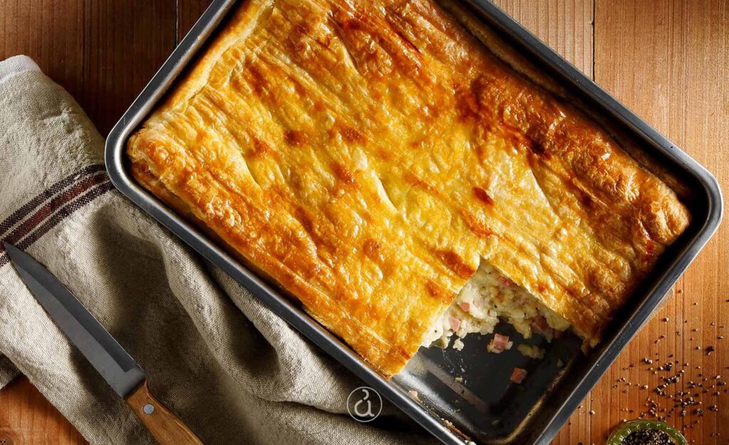 Χαράζουμε ελαφρά την σπιτική ζαμπονοτυρόπιτα με φύλλο κρούστας και χωρίς να την πιέζουμε, την κολλάμε προς τα κάτω.
