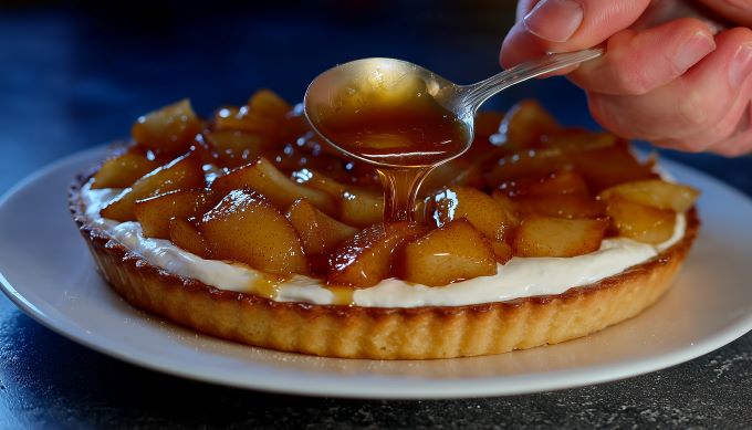 - Ρίχνουμε τη κρέμα στη τάρτα και β