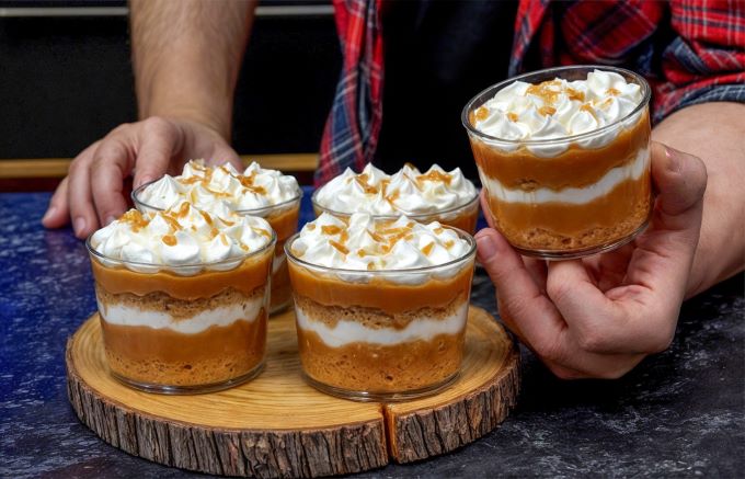 - Ρίχνουμε 2 κ.σ. στο πάτο από 4 ποτηράκια στρώνουμε ομοιόμορφα και συνεχίζουμε με το καραμελωμενο ζαχαρούχο.