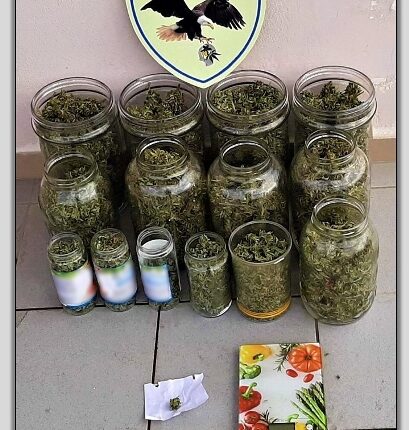 Ειδικότερα, μετά από κατάλληλη αξιοποίηση στοιχείων για διακίνηση ποσοτήτων κάνναβης από το δράστη στην πόλη των Τρικάλων, διενεργήθηκε νομότυπη έρευνα στην οικία του, κατά την οποία βρέθηκαν με τη συνδρομή του αστυνομικού σκύλου ανίχνευσης ναρκωτικών ουσιών “ FLEX ” και κατασχέθηκαν δεκατέσσερα γυάλινα δοχεία και μία χάρτινη συσκευασία με ποσότητες ακατέργαστης κάνναβης, συνολικού βάρους -1.933,5- γραμμαρίων και μια ηλεκτρονική ζυγαριά