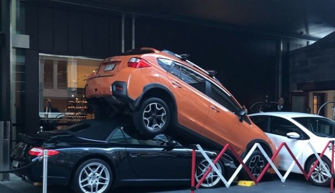 Σύμφωνα με αυτόπτη μάρτυρα, ο παρκαδόρος “πρέπει να πανικοβλήθηκε και να πάτησε το γκάζι με αποτέλεσμα η Porsche να μπει σχεδόν ολόκληρη κάτω από το πορτοκαλί όχημα”. Το SUV χτύπησε με την σειρά του ένα λευκό αυτοκίνητο, που βρισκόταν παρκαρισμένο μπροστά του. Μάλιστα, χρειάστηκε να στηριχτεί με στηριχτεί με πασσάλους για να απελευθερωθεί τόσο ο παρκαδόρος όσο και η κατεστραμμένη Porsche.