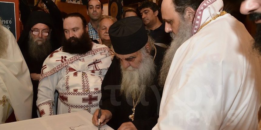 Στη συνέχεια οι Αρχιερέας έπλυνε την Αγία Τράπεζα με σαπούνι και αρώματα, την έχρισαν με Άγιο Μύρο και την ένδυσαν με το «κατασάρκιο» (= ανθεκτικό ύφασμα που τυλίγει την Αγία Τράπεζα δια παντός· επ’ αυτού υπογράφει ο Αρχιερέας) και καινούργια καλύμματα. Ακολούθως έχρισαν με Άγιο Μύρο και τους τοίχους του Ναού σημειώνοντας το μονόγραμμα του Χριστού (Χ Ρ). Τέλος ο Σεπτός Ποιμενάρχης μας κ. Θεόκλητος άναψε την ακοίμητη κανδήλα της Αγίας Τραπέζης και από αυτήν ανάψαμε όλα τα υπόλοιπα κανδήλια.