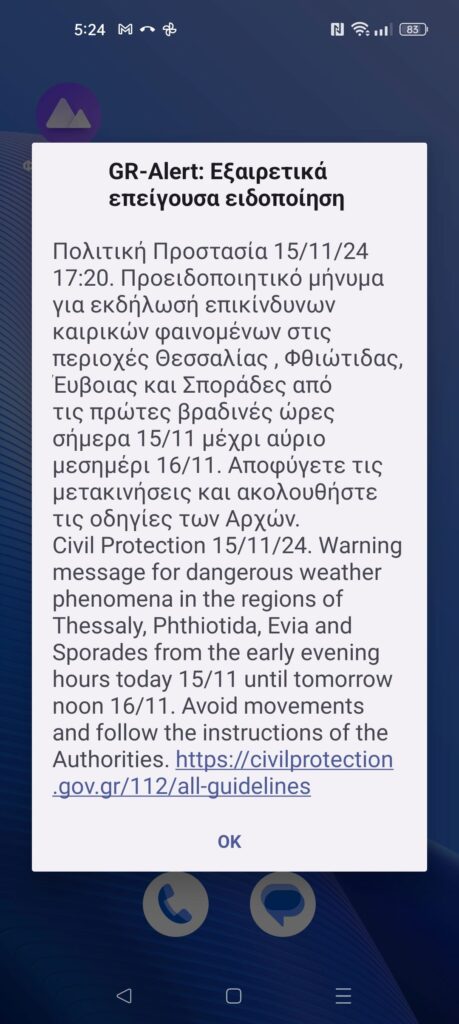 Ειδοποίηση του 112 στα κινητά Τρικαλινών για ακραία καιρικά φαινόμενα Κωνσταντίνος Καραποστόλης 15/11/2024 17:31 Τοπικά 1 Εμφανίσεις Το 112 ήχησε πριν από λίγο σε κινητά τηλέφωνα Τρικαλινών για ακραία καιρικά φαινόμενα τις επόμενες ώρες Δείτε την ειδοποίηση Post Views: 105 2024-11-15 Κωνσταντίνος Καραποστόλης Μοιράσου το Facebook Twitter