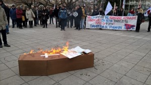 Η πορεία συνεχίστηκε με παλμό και συνθήματα στους δρόμους των Τρικάλων και κατέληξε στην πλατεία Ηρώων Πολυτεχνείου (κεντρική πλατεία) ,όπου οι διαδηλωτές έκαψαν συμβολικά το ομοίωμα του φερέτρου , δείχνοντας ότι στέλνουν στην πυρά τα σχέδια ενταφιασμού της κοινωνικής ασφάλισης.