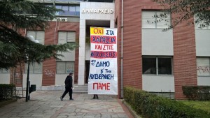 Στη συνέχεια η πορεία πραγματοποίησε ολιγόλεπτη στάση μπροστά στο δημαρχείο της πόλης , όπου στην είσοδό του η Γραμματεία Τρικάλων του ΠΑΜΕ ανάρτησε ένα μεγάλο πανό ενάντια στα χαράτσια και τις κατασχέσεις που επιβάλουν στο λαό των Τρικάλων δήμος και κυβερνήσεις. Εκεί, σύντομο χαιρετισμό απηύθυνε ο Γιώργος Καϊκης , στέλεχος του ΠΑΜΕ και δημοτικός σύμβουλος της «Λαικής Συσπείρωσης», που καταδίκασε τη στάση της δημοτικής αρχής να προσφύγει σε μέτρα αναγκαστικής είσπραξης οφειλών δημοτών από διάφορα δημοτικά τέλη και χαράτσια ,όπως κλήσεις δημοτικής αστυνομίας κ.α., δεσμεύοντας τραπεζικούς λογαριασμούς 4.000 και πλέον δημοτών!!!