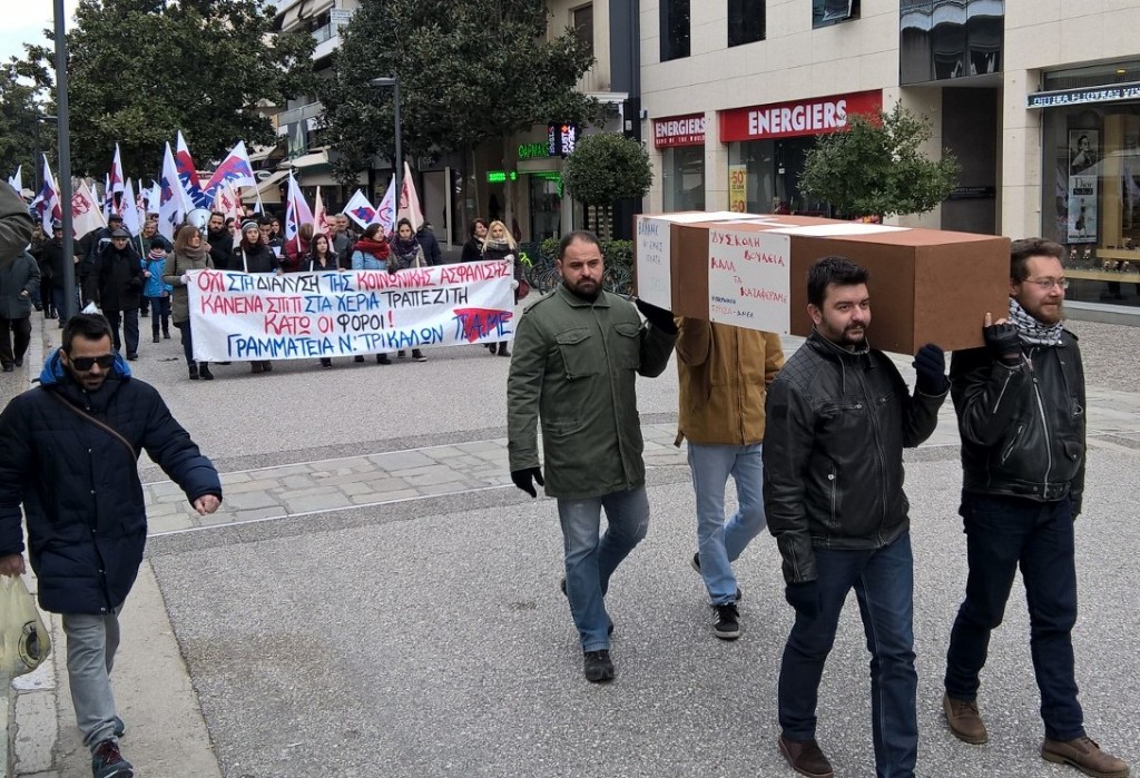 Η πορεία συνεχίστηκε με παλμό και συνθήματα στους δρόμους των Τρικάλων και κατέληξε στην πλατεία Ηρώων Πολυτεχνείου (κεντρική πλατεία) ,όπου οι διαδηλωτές έκαψαν συμβολικά το ομοίωμα του φερέτρου , δείχνοντας ότι στέλνουν στην πυρά τα σχέδια ενταφιασμού της κοινωνικής ασφάλισης.