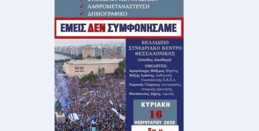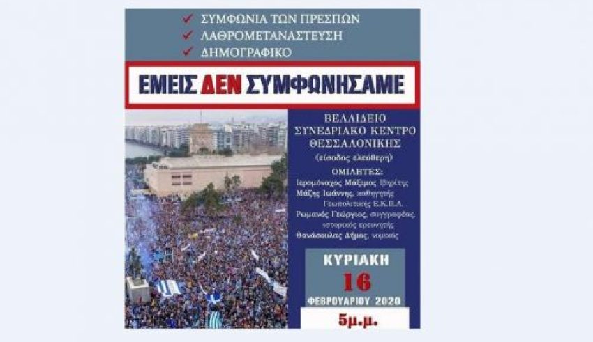 Τά Ὀρθόδοξα Χριστιανικά Σωματεῖα τῆς Θεσσαλονίκης, ἀπό τήν καρδιά τῆς Μίας καί ἑλληνικῆς ΜΑΚΕΔΟΝΙΑΣ, μέ τήν εὐλογία τοῦ Παναγιωτάτου Μητροπολίτου Θεσσαλονίκης κ. Ἀνθίμου, διοργανώνουν ἐκδήλωση διαμαρτυρίας τήν Κυριακή 16 Φεβρουαρίου στίς 5 μ.μ. στό Βελλίδειο Συνεδριακό Κέντρο Θεσσαλονίκης, μέ θέμα τίς ἀνησυχητικές ἐξελίξεις πού λαμβάνουν χώρα στήν πατρίδα μας ἐρήμην τῆς βούλησης τοῦ κυριάρχου ἑλληνικοῦ λαοῦ.