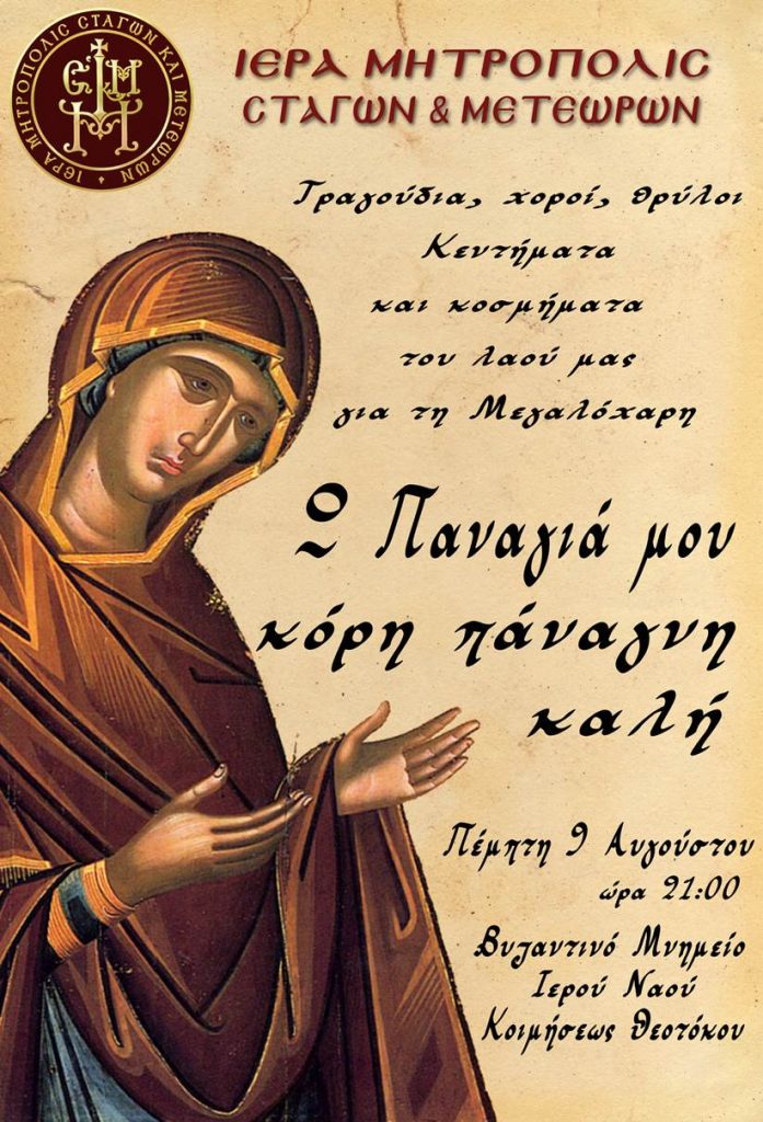 Η Ιερά Μητρόπολη Σταγών και Μετεώρων τιμά την Παναγιά με την εκδήλωση «Ω Παναγιά μου, κόρη πάναγνη , καλή» την Πέμπτη 9 Αυγούστου στις 9 μ.μ στο προαύλιο του Ι. Ναού Κοιμήσεως Θεοτόκου Καλαμπάκας
