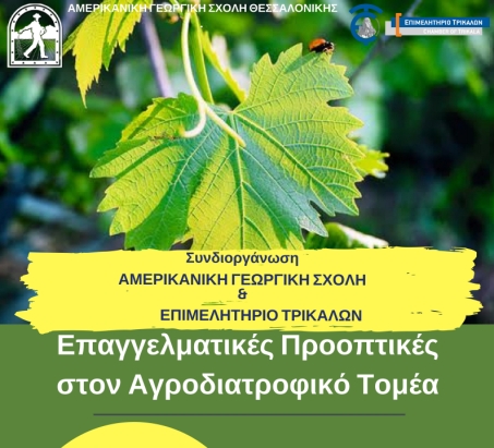 Η Αμερικανική Γεωργική Σχολή και το Επιμελητήριο Τρικάλων συνδιοργανώνουν ενημερωτική εκδήλωση με θέμα «Επαγγελματικές Προοπτικές στον Αγροδιατροφικό Τομέα». Θα πραγματοποιηθεί στην αίθουσα εκδηλώσεων του Επιμελητηρίου Τρικάλων την Πέμπτη 16 Μαρτίου στις 18:00 κι απευθύνεται σε μαθητές, γονείς, απόφοιτους και επαγγελματίες. Κατά τη διάρκειά της θα παρουσιαστούν τα ερευνητικά και εκπαιδευτικά προγράμματα της Σχολής καθώς και τα προγράμματα οικονομικής βοήθειας και υποτροφιών της.