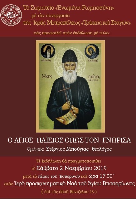 Η Ενωμένη Ρωμηοσύνη σε συνεργασία με την Ιερά Μητρόπολη Τρίκκης και Σταγών σας προσκαλεί στην εκδήλωση με τίτλο “Ο ΑΓΙΟΣ ΠΑΪΣΪΟΣ ΟΠΩΣ ΤΟΝ ΓΝΩΡΙΣΑ”