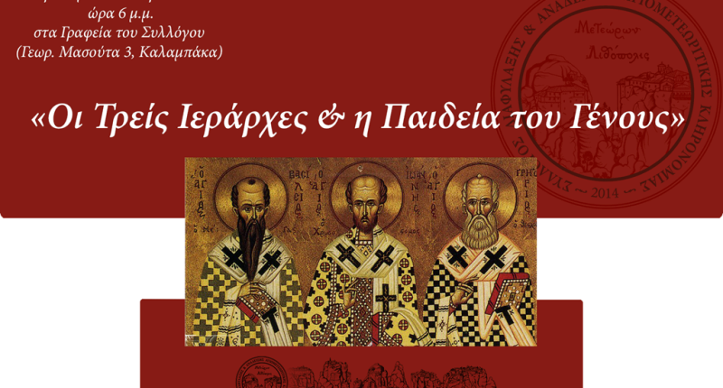 Το Διοικητικό Συμβούλιο του Συλλόγου Διαφύλαξης και Ανάδειξης Αγιομετεωρίτικης Κληρονομιάς «ΜΕΤΕΩΡΩΝ ΛΙΘΟΠΟΛΙΣ», προσκαλεί τα μέλη και τους φίλους του στην εκδήλωση με θέμα «Οι Τρείς Ιεράρχες & η Παιδεία του Γένους», που εντάσσεται στο πλαίσιο των δράσεων με τίτλο «Σύγχρονες Προκλήσεις στον καιρό της Κρίσης», η οποία θα πραγματοποιηθεί την Κυριακή 31 Ιανουαρίου 2016 και ώρα 6 μ.μ. στα γραφεία του Συλλόγου. Μετά την εισαγωγική ομιλία θα προβληθεί βίντεο-αφιέρωμα στο έργο και την προσφορά των Τριών Ιεραρχών στα γράμματα, στην Ορθοδοξία και στην Εκκλησία.