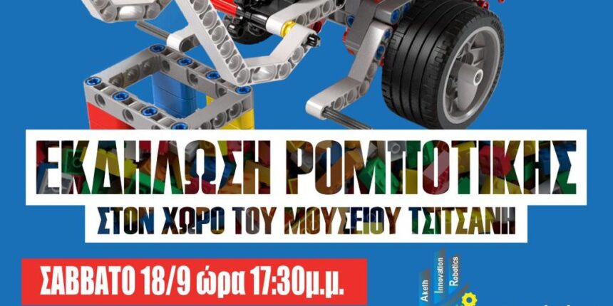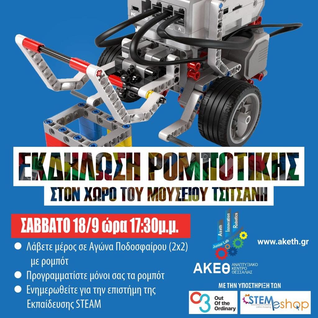 Το Αναπτυξιακό Κέντρο Θεσσαλίας σας προσκαλεί να παρευρεθείτε στην δεύτερη ανοιχτή εκδήλωση Ρομποτικής που θα διοργανωθεί στον προαύλιο χώρο του Μουσείου Τσιτσάνη το Σάββατο 18 Σεπτεμβρίου 2021 και ώρα 17:30 το απόγευμα, προκειμένου να ανακαλύψουν τα παιδιά τον κόσμο της εκπαιδευτικής ρομποτικής και της εκπαίδευσης STEM.