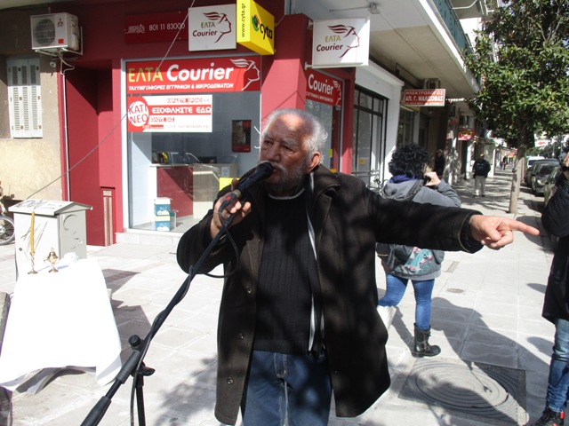 Κατά τις δύο το μεσημέρι, οι εργάτες βγήκαν από το Εργατικό Κέντρο κρατώντας μαύρες σημαίες και λάβαρα με συνθήματα. Ενώθηκαν μαζί με τους αγρότες και συμμετείχαν σε μια ομιλία όπου μίλησε ο κουρέας Σταύρος Καραγκούνης.