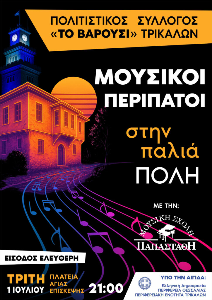 Την Τρίτη 1/7/2025 ο Π.Σ. “Το Βαρούσι” Τρικάλων διοργανώνει συναυλία με τη Μουσική Σχολή Παπαστάθη, “Μουσικοί περίπατοι στην παλιά πόλη”.