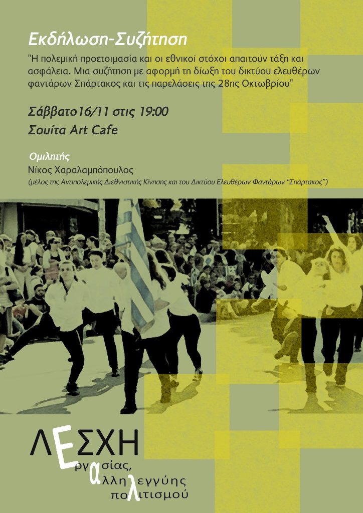 “Η πολεμική προετοιμασία και οι εθνικοί στόχοι απαιτούν τάξη και ασφάλεια. Μια συζήτηση με αφορμή τη δίωξη του Δικτύου Ελεύθερων Φαντάρων Σπάρτακος και τις παρελάσεις της 28ης Οκτωβρίου”.