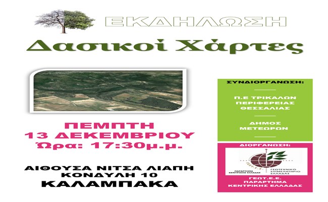 Το ΓΕΩΤΕΕ – Παράρτημα Κεντρικής Ελλάδας σε συνεργασία με την Περιφερειακή Ενότητα Τρικάλων της Περιφέρειας Θεσσαλίας και τον Δήμο Μετεώρων διοργανώνουν την Πέμπτη 13 Δεκεμβρίου 2018 και ώρα 17:30 εκδήλωση με θέμα «Δασικοί Χάρτες».