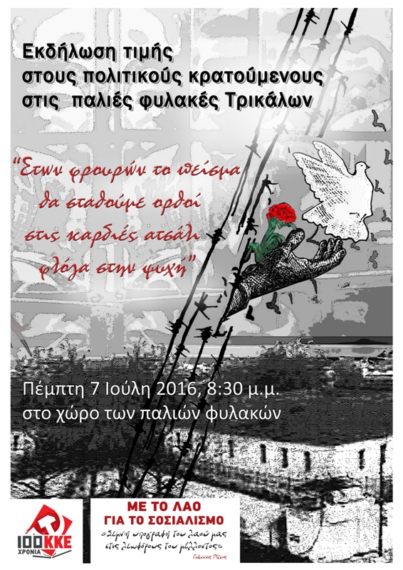 Εκδήλωση των ΤΟ ΤΡΙΚΑΛΩΝ ΤΟΥ ΚΚΕ και της ΚΝΕ στις παλιές φυλακές Τρικάλων την ΠΕΜΠΤΗ 7 ΙΟΥΛΗ 2016, στις 8:30