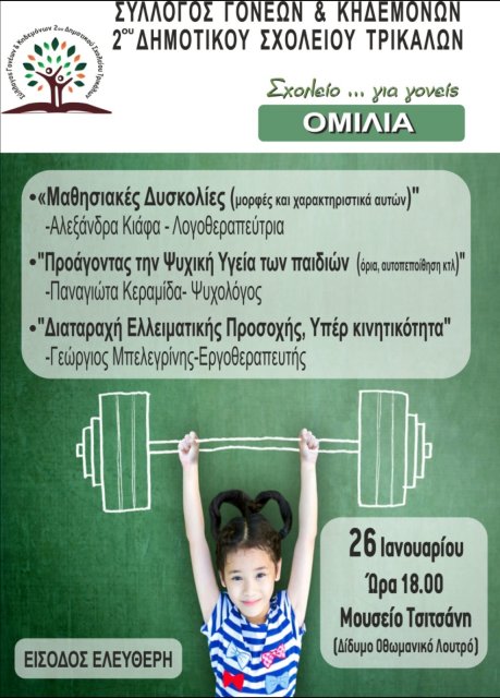 Συνεχίζοντας τις δράσεις του, ο Σύλλογος Γονέων & Κηδεμόνων του 2ου Δημοτικού Σχολείου, διοργανώνει μια σειρά ομιλιών για το 2020 με σκοπό να ενημερώσει και να επιμορφώσει τους γονείς σε καίρια θέματα που αφορούν τα παιδιά. Την προσεχή Κυριακή 26 Ιανουαρίου και ώρα 18.00 μ.μ, στην αίθουσα του Δίδυμου Οθωμανικού Λουτρού, στο Μουσείο Τσιτσάνη, θα πραγματοποιηθεί η πρώτη προγραμματισμένη διάλεξη με τα εξής θέματα: