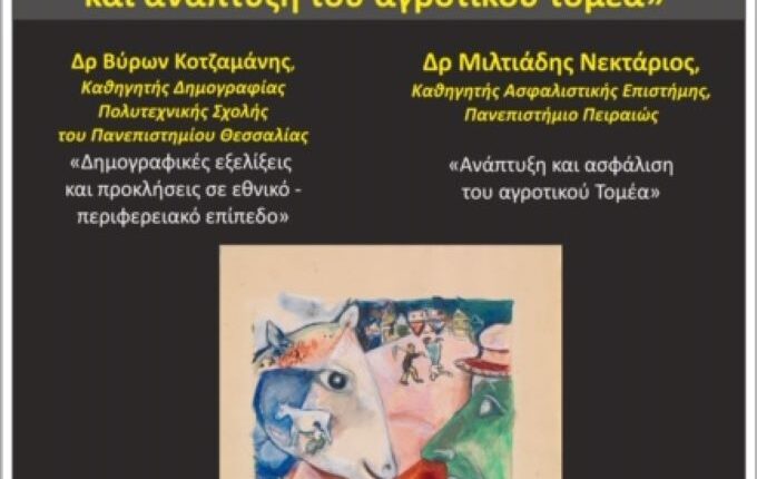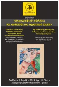 Εκδήλωση με Θέμα “Δημογραφικές Εξελίξεις και Ανάπτυξη του Αγροτικού Τομέα” με ομιλητές τους Δρ. Β. Κοτζαμάνη και Δρ. Μ. Νεκτάριο, η οποία θα πραγματοποιηθεί το Σάββατο 05 Απριλίου 2025 και ώρα 11:00 στο Μουσείο Τσιτσάνη.