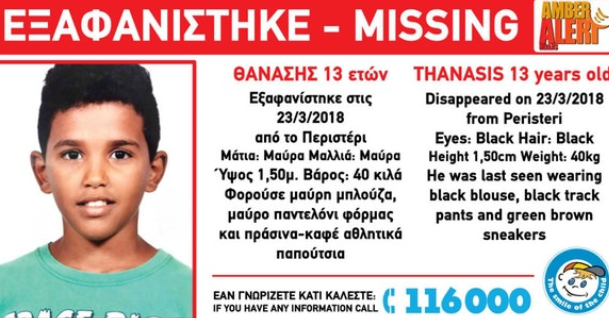 Ο Θανάσης, εξαφανίστηκε στις 23/03/2018 από το Περιστέρι και «Το Χαμόγελο του Παιδιού», την ίδια ημέρα προχώρησε στην ενεργοποίηση του μηχανισμού έγκυρης και έγκαιρης ενημέρωσης πολιτών για περιστατικά εξαφάνισης ανηλίκων, Amber Alert.