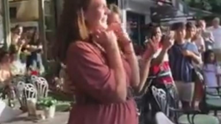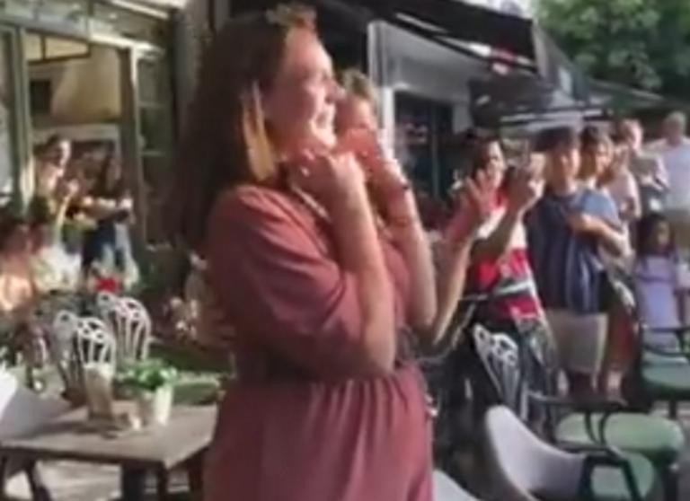 Η ίδια μόλις συνειδητοποιεί τι γίνεται, πλησιάζει την παρέα του αγαπημένου της μην κρύβοντας την συγκίνηση της για το ρομαντικό σκηνικό που λαμβάνει χώρα και μάλιστα με πρωταγωνίστρια την ίδια.